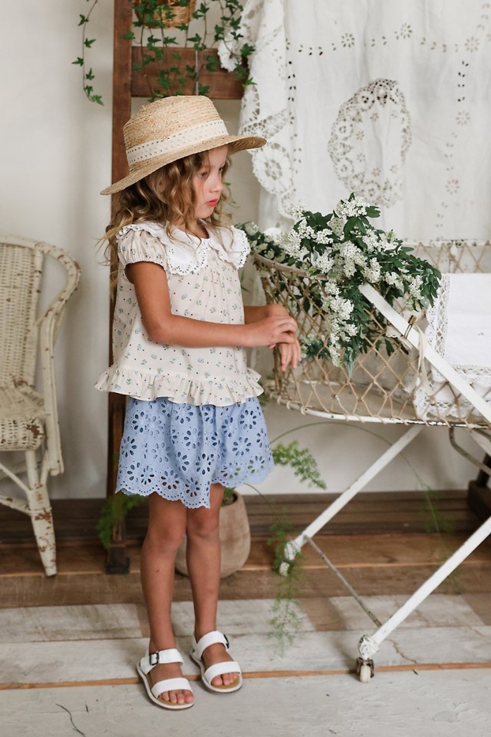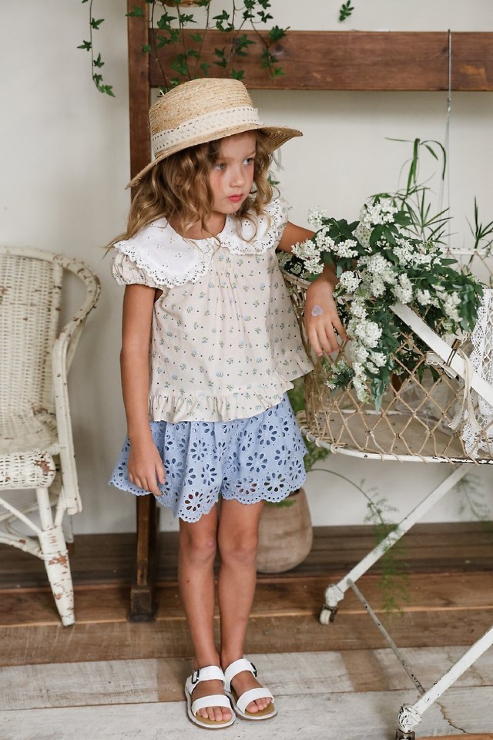 FLO39|(75-140) 蕾絲翻領碎花公主袖上衣