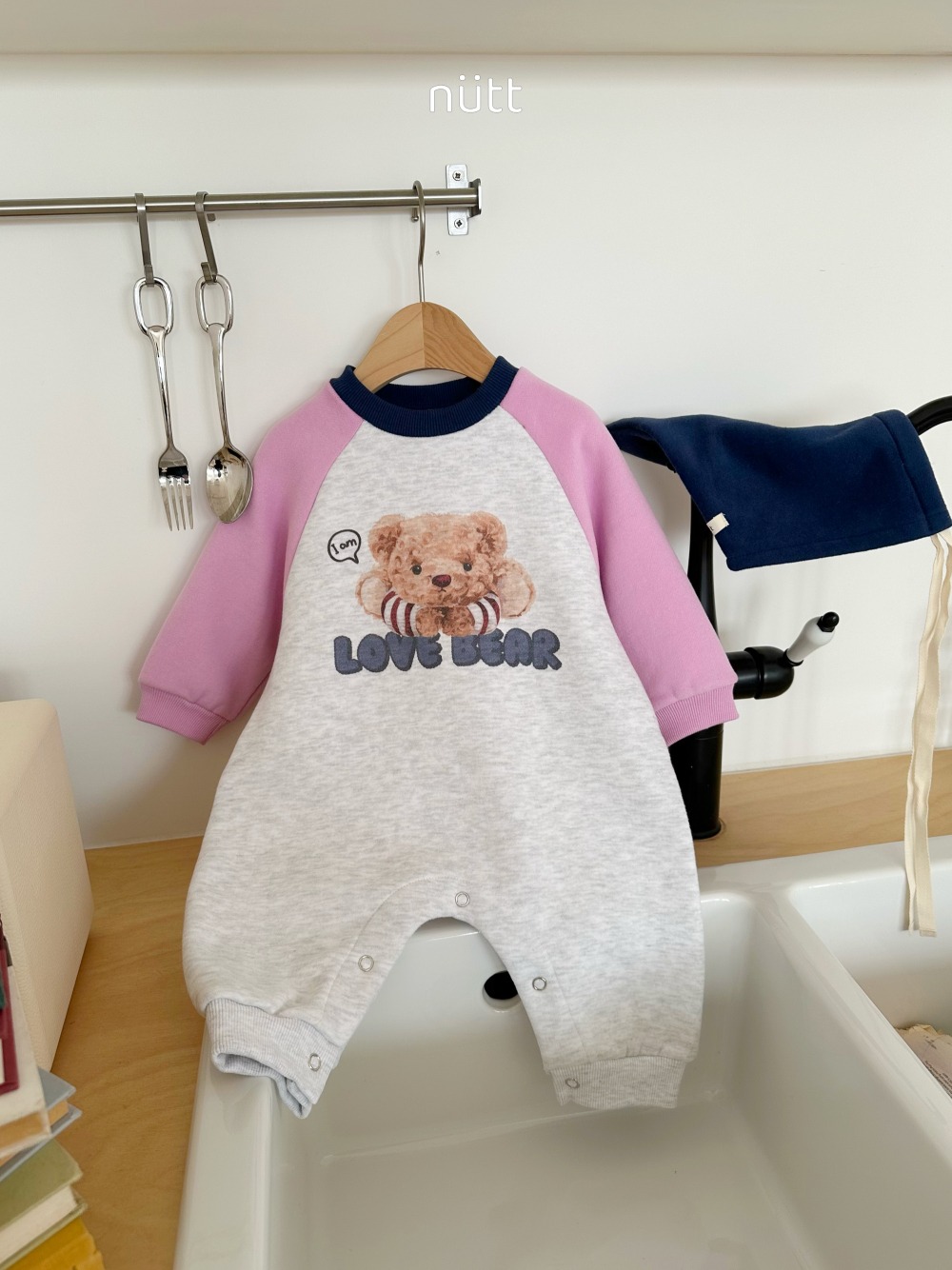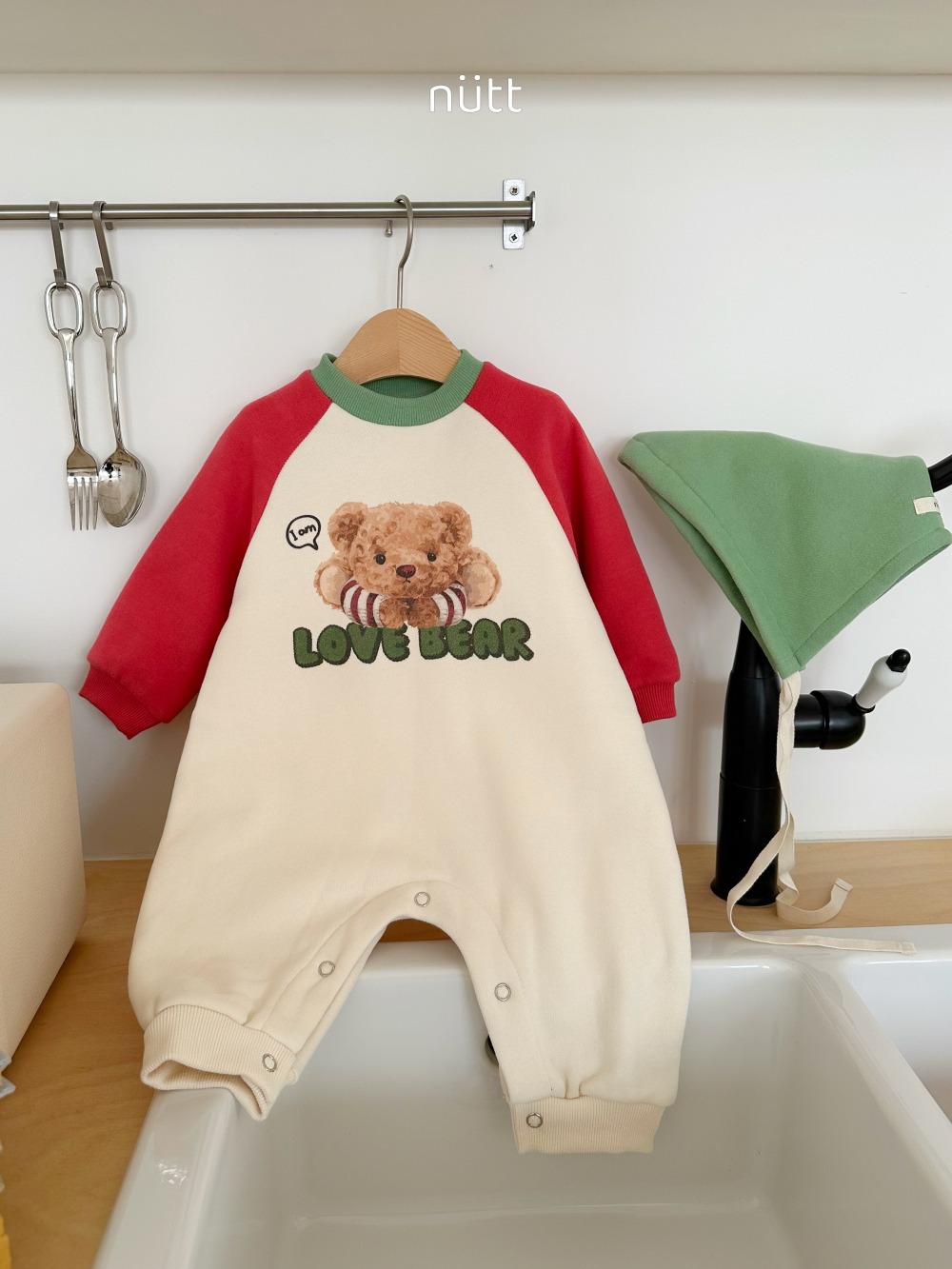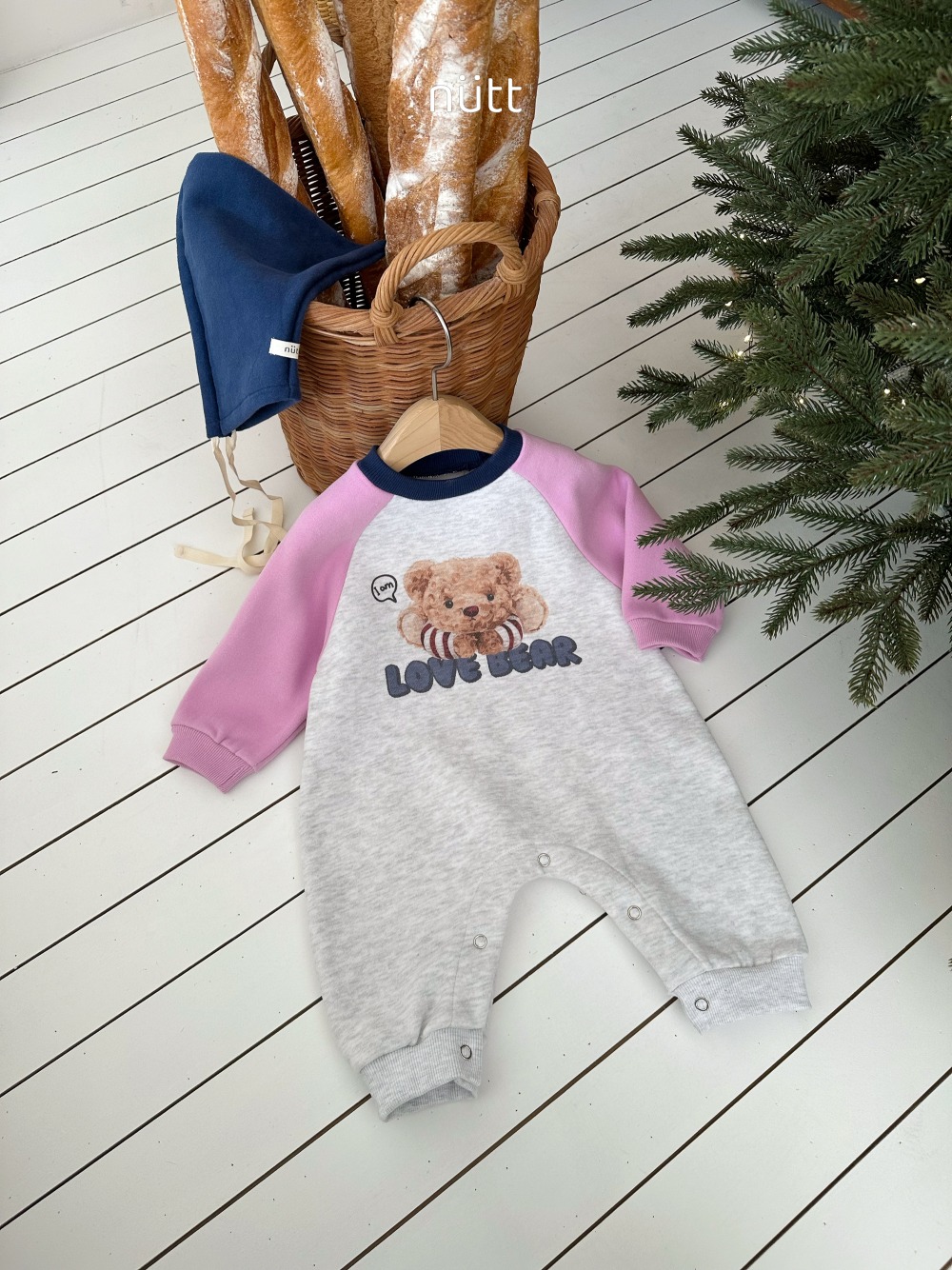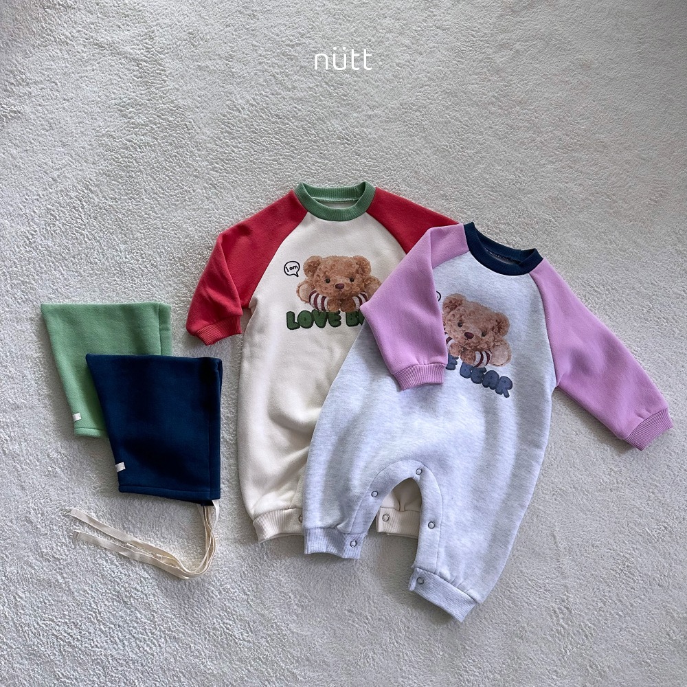 Nutt01|(3m-16m) 小熊印花撞色休閒連身衣含帽子