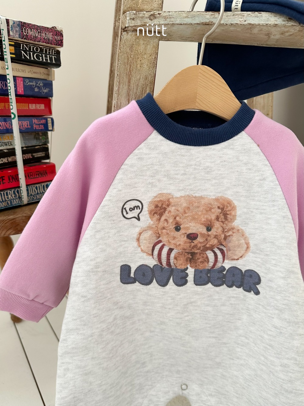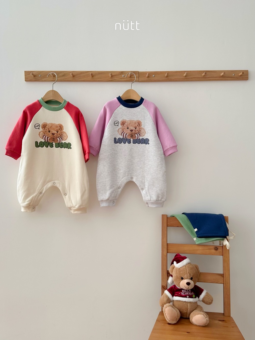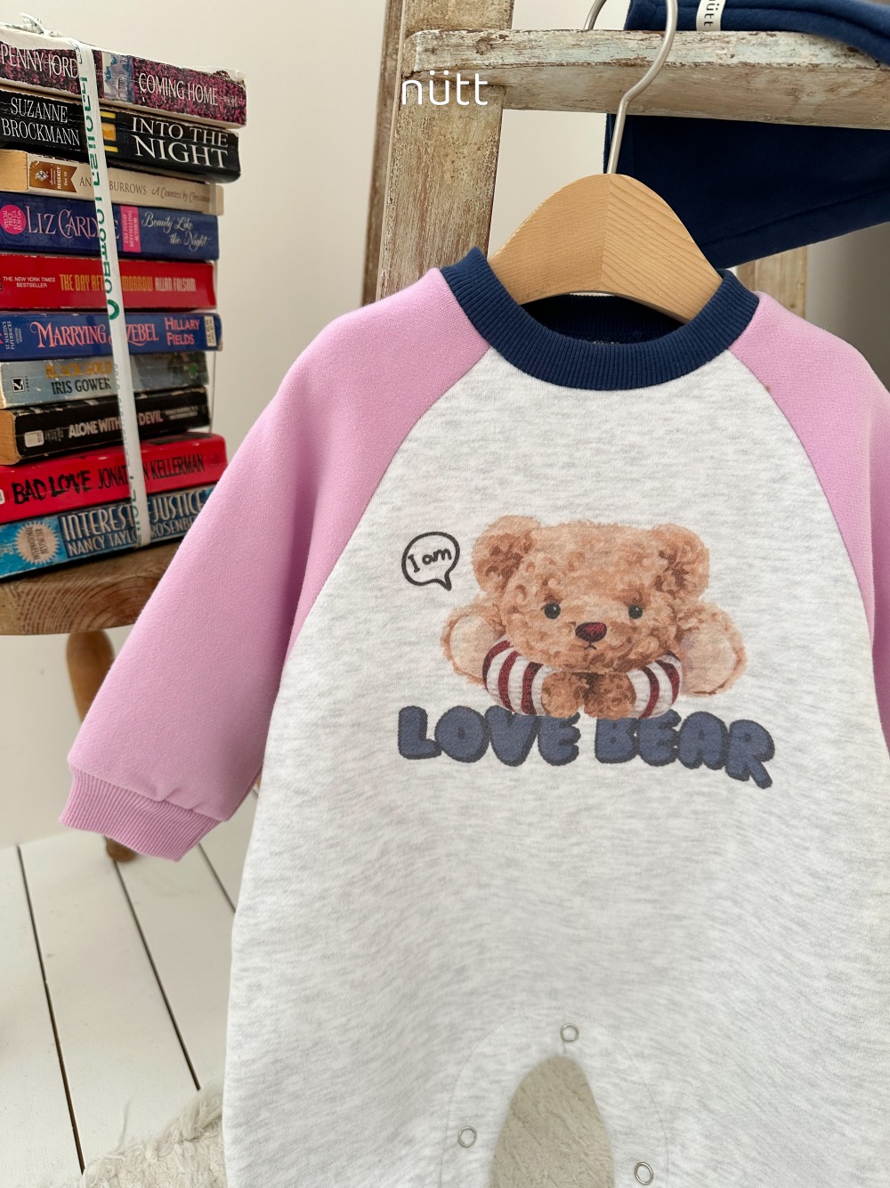 Nutt01|(3m-16m) 小熊印花撞色休閒連身衣含帽子
